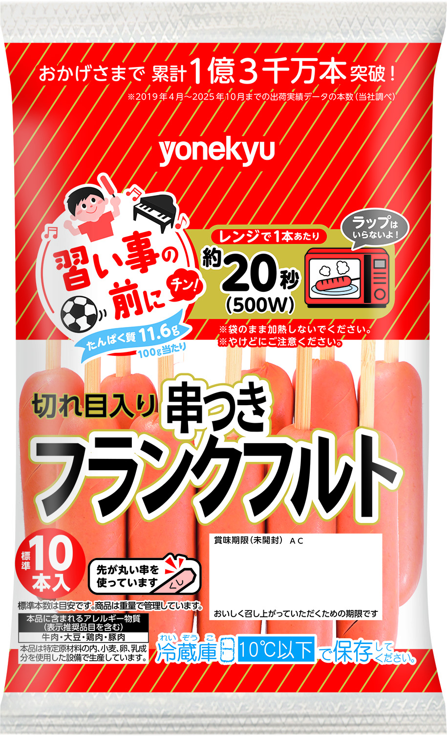 鶏肉(国産又はタイ又はブラジル)、豚脂肪、豚肉、植物油脂、糖類(ぶどう糖、砂糖)、大豆たん白、食塩、野菜エキス調味料、香辛料、醸造酢、たん白加水分解物 / 加工デンプン、調味料(アミノ酸等)、リン酸塩(Na、K)、pH調整剤、酸化防止剤(ビタミンC)、発色剤(亜硝酸Na)、(一部に牛肉・大豆・鶏肉・豚肉を含む)
